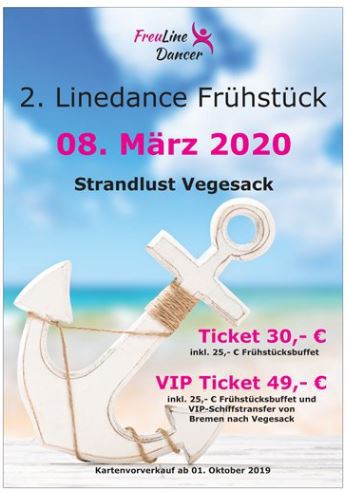 Das "VIP-Ticket" kostet 49,- € und beinhaltet ein Frühstücksbuffet im Wert von 25,- €. Außerdem haben wir ein Schiff gechartert - nur für FreuLineDancer & friends - mit dem wir euch vom Martini Anleger direkt zum Anleger an der Strandlust in Vegesack bringen.