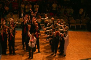 Die Stimmung im Maritim war auf dem Höhepunkt! Der Saal bebte und feierte die Teams. Wenngleich der Heimvorteil der Kölner Teams nicht zu überhören war. Im Anschluß wurden alle Teams auf die Tanzfläche gebeten und die Stunde der Entscheidung war da. Zuerst die "offene Wertung" für das Männerteam aus London: Hier wurde in der Überzahl die "Zweien" gezogen". Das bedeutet im Ergebnis wie in den "Schulnoten" der zweite Platz. Ein Wertungsrichter zog sogar die "sechs" für die Tänzer aus England, und honorierte damit wohl der Regelverstoß , der Tanzgruppe.. Die Hüten auf den Köpfen der Tänzer waren nämlich ausdrücklich nicht erlaubt !